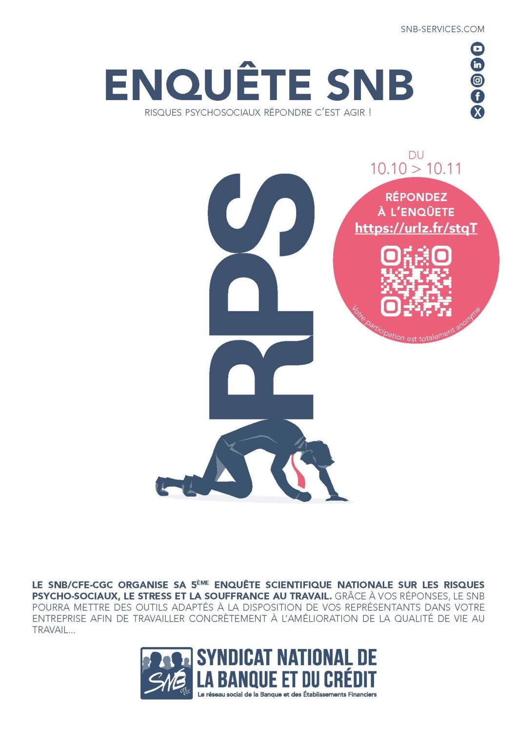 Nous profitons de la semaine de la santé mentale du 07 au 13 octobre pour relancer notre 5ème enquête sur les RPS.