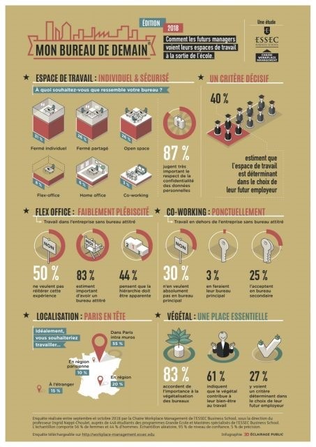 Méthodologie: Enquête réalisée entre septembre et octobre 2018 par la Chaire Workplace Management de l’ESSEC Business School, sous la direction du professeur Ingrid Nappi-Choulet, auprès de 446 étudiants des programmes Grande Ecole et Mastères spécialisés de l’ESSEC Business School. L’échantillon comporte 56 % de femmes et 44 % d’hommes. Échantillon aléatoire, 95 % de niveau de confiance, 5 % de précision.