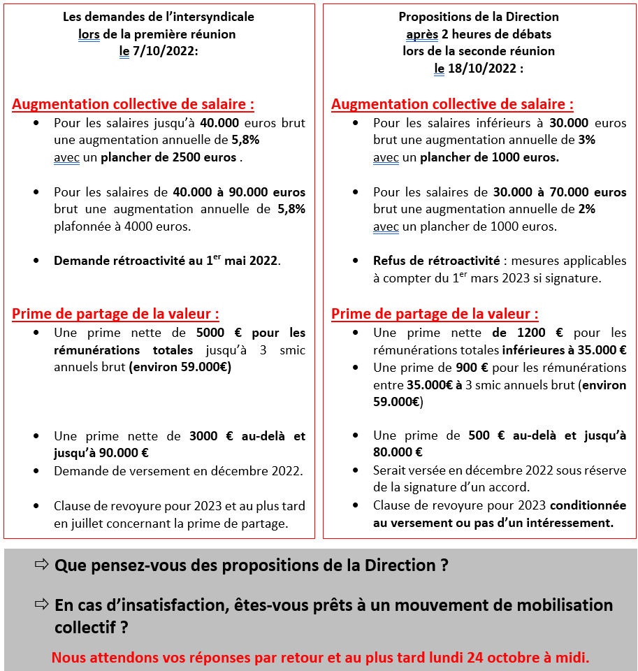 Ce jour, après une première proposition jugée inacceptable par l’Intersyndicale, la Direction nous est revenue avec des propositions encore très éloignées de vos demandes…